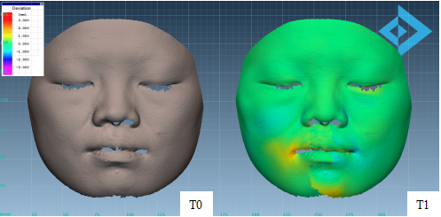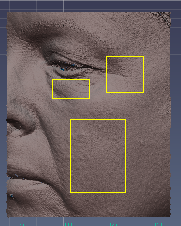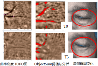 2. 評(píng)估:可評(píng)估全臉或局部皮膚的皺紋,幅度、體積、面積、深度、周長(zhǎng)、皺紋密度、進(jìn)行目標(biāo)區(qū)域的提取,3D偏差比較等。